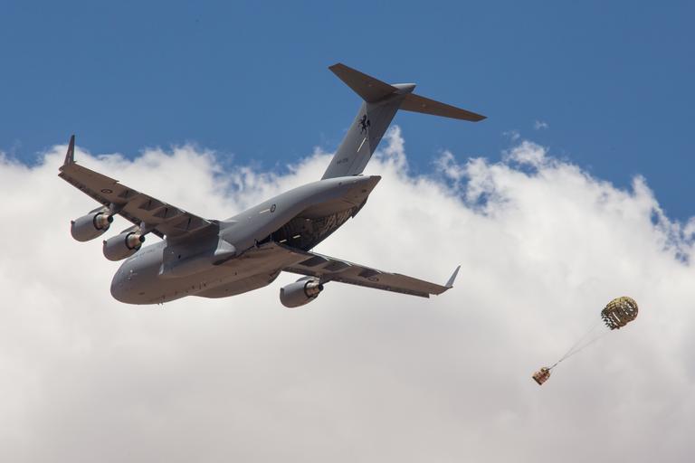 Keywords: RAAF C-17 Globemaster A41-209 during an exercise in 2014.jpg en A Royal Australian air force C-17 Globemaster III with No 36 Squadron 36 SQN airdrops a simulated load above Hubar drop zone at Fort Huachuca Ariz June 18 2014 No 36 SQN was participating in a two-week tactics courses hosted by the AATTC attached to the 139th Airlift Wing Missouri Air National Guard 2014-06-19 13 05 49 http //www dvidshub net/image/1415929/royal-australian-air-force-trains-with-missouri-air-national-guard VBwEpvmSwlI Senior Airman Patrick Evenson PD-USGov Uploaded with UploadWizard A41-209 aircraft Fort Huachuca |