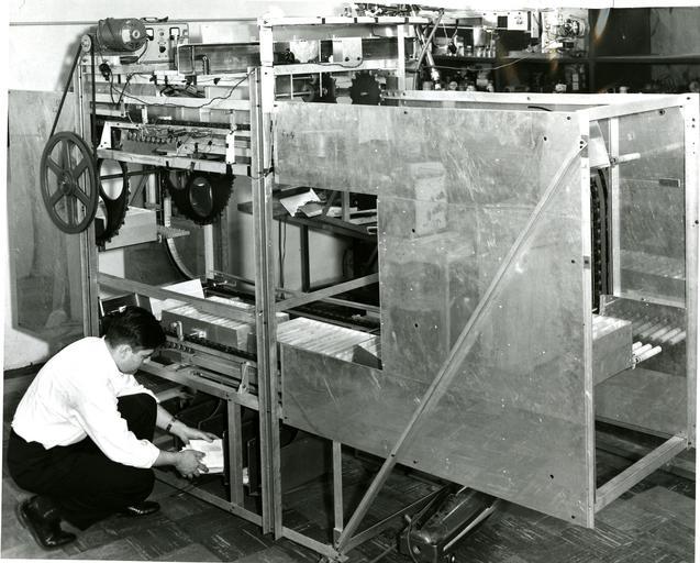 | Keywords: RabinowJacob 042.jpg  Overall view of the laboratory prototype machine developed for the Post Office for the automatic high-speed sorting of letter mail It can sort at the rate of 36 ooo letters per hour into as many categories as may be needed It consists essentially of a large number of pockets on an endless conveyor and electromechanical equipment that controls the dropping of a letter from a pocket into a specific fixed receptacle As can be seen in the photographs fourteen pockets are grouped together into a single unit for convenience of handling on the conveyor In 1957 Jacob Rabinowâ ‚¬ „˘s company Rabinow Engineering designed a mechanical coding and sorting system for the U S Post Office Based on similar work Rabinow had done previously for the Census Bureau the system for the Post Office consisted of a conveyor belt cart designed to carry 12 envelopes in separate compartments Each compartment in the cart was accompanied by an escort memory The escort memory consisted of a shaft carrying a series of nylon code wheels Each of the 134 wheels could move laterally into one of two positions With this combination more than 8000 in decimal notation binary numbers could be set Twelve keyboard operators would read envelope addresses and set the positions of the code wheels The wheels were supported on a track also composed of binary elements When the encoded compartment hit the same encoded position on the track the shaft dropped triggering a door release in the compartment holding the envelope The envelope then fell into the appropriate pocket About 600 of the letter sorting machines were built and used by the Post Office In later operations optical character recognition technology replaced the keyboard operators and the mechanical escort memory was replaced by computer memory Reference Inventing for Fun and Profit Jacob Rabinow San Francisco Press San Francisco CA 1990 pp 100-138 National Institute of Standards and Technology 4/1/1958 National Institute of Standards and Technology PD-USGov-NIST PD-USGov Postal equipment |