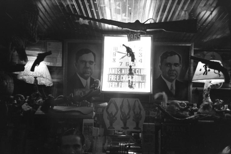 | Keywords: RacelandBarClockEveryManAKing.jpg Interior of bar in Raceland Louisiana Area behind the cash-register has illuminated electric clock advertising Friday night crab boil two portraits of Huey P Long and various firearms Photo by Russell Lee for Farm Security Administration/WPA via http //hdl loc gov/loc pnp/fsa 8a23710; TIF cropped contrast adjusted and converted to jpg 1938-09 Creator Russell Lee PD-USGov Raw TIFF File RacelandBarClockEveryManAKing tif 1938 in Louisiana Interiors of bars in Louisiana Bars in Raceland Louisiana Clocks in Louisiana Time 08 47 Huey P Long Russell Lee Black and white photographs of Louisiana |