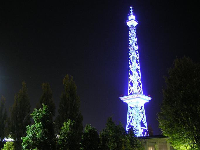 Keywords: radio tower berlin night tower illuminated blue architecture building transmission tower