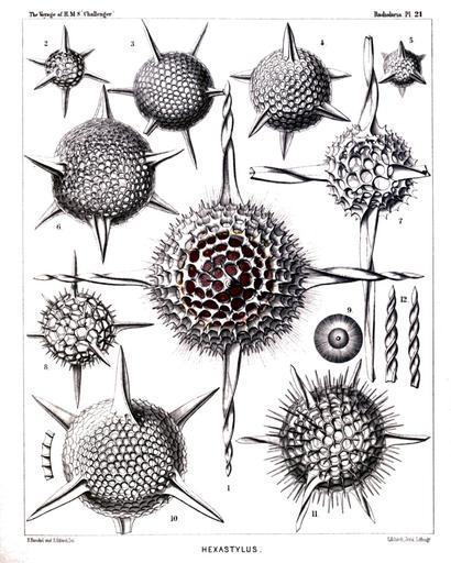 | Keywords: Radiolaria (Challenger) Plate 021.jpg follows <table> <tr> <td style text-align center; vertical-align top; colspan 3 >Plate 21 Cubosphærida </td> </tr> <tr> <td style font-size 85 ; text-align right; vertical-align top; colspan 3 >Diam </td> </tr> <tr> <td style vertical-align top; >Fig 1 Hexastylus cochleatus n sp </td> <td style vertical-align bottom; >×</td> <td style text-align right; vertical-align bottom; >400</td> </tr> <tr> <td style font-size 85 ; padding-left 3em; text-indent -1em; vertical-align top; >From the central caspule enclosed in the shell numerous delicate radial pseudopodia arise which are protruded through the pores of the shell </td> </tr> <tr> <td style vertical-align top; >Fig 2 Hexastylus triaxonius n sp </td> <td style vertical-align bottom; >×</td> <td style text-align right; vertical-align bottom; >400</td> </tr> <tr> <td style vertical-align top; >Fig 3 Hexastylus phænaxonius n sp </td> <td style vertical-align bottom; >×</td> <td style text-align right; vertical-align bottom; >300</td> </tr> <tr> <td style vertical-align top; >Fig 4 Hexastylus thaletis n sp </td> <td style vertical-align bottom; >×</td> <td style text-align right; vertical-align bottom; >400</td> </tr> <tr> <td style vertical-align top; >Fig 5 Hexastylus minimus n sp </td> <td style vertical-align bottom; >×</td> <td style text-align right; vertical-align bottom; >400</td> </tr> <tr> <td style vertical-align top; >Fig 6 Hexastylus dimensivus n sp </td> <td style vertical-align bottom; >×</td> <td style text-align right; vertical-align bottom; >400</td> </tr> <tr> <td style vertical-align top; >Fig 7 Hexastylus spiralis n sp </td> <td style vertical-align bottom; >×</td> <td style text-align right; vertical-align bottom; >400</td> </tr> <tr> <td style vertical-align top; >Fig 8 Hexastylus dictyotus n sp </td> <td style vertical-align bottom; >×</td> <td style text-align right; vertical-align bottom; >400</td> </tr> <tr> <td style vertical-align top; >Fig 9 Hexastylus dictyotus n sp </td> <td style vertical-align bottom; >×</td> <td style text-align right; vertical-align bottom; >400</td> </tr> <tr> <td style font-size 85 ; padding-left 3em; text-indent -1em; vertical-align top; >Central capsule with concentric nucleus and nucleolus; the protoplasm is radially striped </td> </tr> <tr> <td style vertical-align top; >Fig 10 Hexastylus marginatus n sp </td> <td style vertical-align bottom; >×</td> <td style text-align right; vertical-align bottom; >400</td> </tr> <tr> <td style font-size 85 ; padding-left 3em; text-indent -1em; vertical-align top; >Fig 10a Radial section through the shell-wall </td> </tr> <tr> <td style vertical-align top; >Fig 11 Hexastylus solonis n sp </td> <td style vertical-align bottom; >×</td> <td style text-align right; vertical-align bottom; >400</td> </tr> <tr> <td style vertical-align top; >Fig 12 Hexastylus contortus n sp </td> <td style vertical-align bottom; >×</td> <td style text-align right; vertical-align bottom; >300</td> </tr> </table> https //archive org/details/reportonradiolar00haecrich 1887 Ernst Haeckel 1834-1919 ; engravings by Adolf Giltsch 1852-1911 PD-old-auto-1923 1919 Report on the Radiolaria |