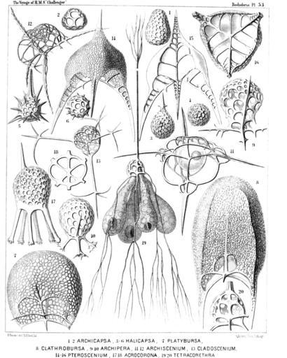 | Keywords: Radiolaria (Challenger) Plate 053.jpg follows <table> <tr> <td style text-align center; vertical-align top; colspan 3 >Plate 53 Zygospyrida Tripocalpida Phænocalpida et Cyrtocalpida </td> </tr> <tr> <td style font-size 85 ; text-align right; vertical-align top; colspan 3 >Diam </td> </tr> <tr> <td style vertical-align top; >Fig 1 Archicapsa triforis n sp </td> <td style vertical-align bottom; >×</td> <td style text-align right; vertical-align bottom; >300</td> </tr> <tr> <td style font-size 85 ; padding-left 3em; text-indent -1em; vertical-align top; >Lateral view </td> </tr> <tr> <td style vertical-align top; >Fig 2 Archicapsa triforis n sp </td> <td style vertical-align bottom; >×</td> <td style text-align right; vertical-align bottom; >300</td> </tr> <tr> <td style font-size 85 ; padding-left 3em; text-indent -1em; vertical-align top; >Basal view </td> </tr> <tr> <td style vertical-align top; >Fig 3 Halicapsa triglochin n sp </td> <td style vertical-align bottom; >×</td> <td style text-align right; vertical-align bottom; >200</td> </tr> <tr> <td style font-size 85 ; padding-left 3em; text-indent -1em; vertical-align top; >Lateral view </td> </tr> <tr> <td style vertical-align top; >Fig 4 Halicapsa triglochin n sp </td> <td style vertical-align bottom; >×</td> <td style text-align right; vertical-align bottom; >200</td> </tr> <tr> <td style font-size 85 ; padding-left 3em; text-indent -1em; vertical-align top; >Basal view </td> </tr> <tr> <td style vertical-align top; >Fig 5 Halicapsa hystrix n sp </td> <td style vertical-align bottom; >×</td> <td style text-align right; vertical-align bottom; >200</td> </tr> <tr> <td style font-size 85 ; padding-left 3em; text-indent -1em; vertical-align top; >Lateral view </td> </tr> <tr> <td style vertical-align top; >Fig 6 Halicapsa hystrix n sp </td> <td style vertical-align bottom; >×</td> <td style text-align right; vertical-align bottom; >200</td> </tr> <tr> <td style font-size 85 ; padding-left 3em; text-indent -1em; vertical-align top; >Basal view </td> </tr> <tr> <td style vertical-align top; >Fig 7 Cantharospyris platybursa n sp vel Platybursa compressa </td> <td style vertical-align bottom; >×</td> <td style text-align right; vertical-align bottom; >400</td> </tr> <tr> <td style vertical-align top; >Fig 8 Tessarospyris clathrobursa n sp vel Clathrobursa dictyopus </td> <td style vertical-align bottom; >×</td> <td style text-align right; vertical-align bottom; >400</td> </tr> <tr> <td style vertical-align top; >Fig 9 Peridium spinipes n sp </td> <td style vertical-align bottom; >×</td> <td style text-align right; vertical-align bottom; >500</td> </tr> <tr> <td style vertical-align top; >Fig 10 Peridium palmipes n sp </td> <td style vertical-align bottom; >×</td> <td style text-align right; vertical-align bottom; >500</td> </tr> <tr> <td style vertical-align top; >Fig 11 Archiscenium quadrispinum n sp </td> <td style vertical-align bottom; >×</td> <td style text-align right; vertical-align bottom; >500</td> </tr> <tr> <td style font-size 85 ; padding-left 3em; text-indent -1em; vertical-align top; >In the spherical central capsule the dark nucleus is visible </td> </tr> <tr> <td style vertical-align top; >Fig 12 Euscenium eucolpium n sp </td> <td style vertical-align bottom; >×</td> <td style text-align right; vertical-align bottom; >500</td> </tr> <tr> <td style vertical-align top; >Fig 13 Cladoscenium ancoratum n sp </td> <td style vertical-align bottom; >×</td> <td style text-align right; vertical-align bottom; >400</td> </tr> <tr> <td style vertical-align top; >Fig 14 Pteroscenium pinnatum n sp </td> <td style vertical-align bottom; >×</td> <td style text-align right; vertical-align bottom; >400</td> </tr> <tr> <td style font-size 85 ; padding-left 3em; text-indent -1em; vertical-align top; >Lateral view </td> </tr> <tr> <td style vertical-align top; >Fig 15 Pteroscenium pinnatum n sp </td> <td style vertical-align bottom; >×</td> <td style text-align right; vertical-align bottom; >400</td> </tr> <tr> <td style font-size 85 ; padding-left 3em; text-indent -1em; vertical-align top; >Vertical section </td> </tr> <tr> <td style vertical-align top; >Fig 16 Pteroscenium pinnatum n sp </td> <td style vertical-align bottom; >×</td> <td style text-align right; vertical-align bottom; >400</td> </tr> <tr> <td style font-size 85 ; padding-left 3em; text-indent -1em; vertical-align top; >Basal view </td> </tr> <tr> <td style vertical-align top; >Fig 17 Calpophæna hexarrhabda n sp </td> <td style vertical-align bottom; >×</td> <td style text-align right; vertical-align bottom; >400</td> </tr> <tr> <td style vertical-align top; >Fig 18 Calpophæna hexarrhabda n sp </td> <td style vertical-align bottom; >×</td> <td style text-align right; vertical-align bottom; >400</td> </tr> <tr> <td style font-size 85 ; padding-left 3em; text-indent -1em; vertical-align top; >Basal plate </td> </tr> <tr> <td style vertical-align top; >Fig 19 Tetraspyris tetracorethra n sp </td> <td style vertical-align bottom; >×</td> <td style text-align right; vertical-align bottom; >400</td> </tr> <tr> <td style font-size 85 ; padding-left 3em; text-indent -1em; vertical-align top; >With the four-lobed central capsule in each lobe an oil-globule </td> </tr> <tr> <td style vertical-align top; >Fig 20 Tetraspyris tetracorethra n sp </td> <td style vertical-align bottom; >×</td> <td style text-align right; vertical-align bottom; >800</td> </tr> <tr> <td style font-size 85 ; padding-left 3em; text-indent -1em; vertical-align top; >Shell more enlarged </td> </tr> </table> https //archive org/details/reportonradiolar00haecrich 1887 Ernst Haeckel 1834-1919 ; engravings by Adolf Giltsch 1852-1911 PD-old-auto-1923 1919 Report on the Radiolaria |
