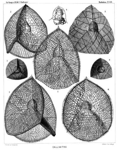 | Keywords: Radiolaria (Challenger) Plate 063.jpg follows <table> <tr> <td style text-align center; vertical-align top; colspan 3 >Plate 63 Tripocyrtida </td> </tr> <tr> <td style font-size 85 ; text-align right; vertical-align top; colspan 3 >Diam </td> </tr> <tr> <td style vertical-align top; >Fig 1 Callimitra carolotæ n sp </td> <td style vertical-align bottom; >×</td> <td style text-align right; vertical-align bottom; >400</td> </tr> <tr> <td style font-size 85 ; padding-left 3em; text-indent -1em; vertical-align top; >Lateral view </td> </tr> <tr> <td style vertical-align top; >Fig 2 Callimitra annæ n sp </td> <td style vertical-align bottom; >×</td> <td style text-align right; vertical-align bottom; >400</td> </tr> <tr> <td style font-size 85 ; padding-left 3em; text-indent -1em; vertical-align top; >Dorsal view </td> </tr> <tr> <td style vertical-align top; >Fig 3 Callimitra emmæ n sp </td> <td style vertical-align bottom; >×</td> <td style text-align right; vertical-align bottom; >300</td> </tr> <tr> <td style font-size 85 ; padding-left 3em; text-indent -1em; vertical-align top; >Lateral view </td> </tr> <tr> <td style vertical-align top; >Fig 4 Callimitra emmæ n sp </td> <td style vertical-align bottom; >×</td> <td style text-align right; vertical-align bottom; >400</td> </tr> <tr> <td style font-size 85 ; padding-left 3em; text-indent -1em; vertical-align top; >Cephalis alone with the enclosed four-lobed central capsule and the internal four divergent beams; surrounded by some scattered xanthellæ </td> </tr> <tr> <td style vertical-align top; >Fig 5 Callimitra agnesæ n sp </td> <td style vertical-align bottom; >×</td> <td style text-align right; vertical-align bottom; >400</td> </tr> <tr> <td style font-size 85 ; padding-left 3em; text-indent -1em; vertical-align top; >Dorsal view </td> </tr> <tr> <td style vertical-align top; >Fig 6 Callimitra elisabethæ n sp </td> <td style vertical-align bottom; >×</td> <td style text-align right; vertical-align bottom; >400</td> </tr> <tr> <td style font-size 85 ; padding-left 3em; text-indent -1em; vertical-align top; >Lateral view </td> </tr> <tr> <td style vertical-align top; >Fig 7 Callimitra carolotæ n sp </td> <td style vertical-align bottom; >×</td> <td style text-align right; vertical-align bottom; >200</td> </tr> <tr> <td style font-size 85 ; padding-left 3em; text-indent -1em; vertical-align top; >Seen from above from the apical pole </td> </tr> <tr> <td style vertical-align top; >Fig 8 Callimitra carolotæ n sp </td> <td style vertical-align bottom; >×</td> <td style text-align right; vertical-align bottom; >200</td> </tr> <tr> <td style font-size 85 ; padding-left 3em; text-indent -1em; vertical-align top; >Seen from below from the basal pole </td> </tr> </table> https //archive org/details/reportonradiolar00haecrich 1887 Ernst Haeckel 1834-1919 ; engravings by Adolf Giltsch 1852-1911 PD-old-auto-1923 1919 Report on the Radiolaria |