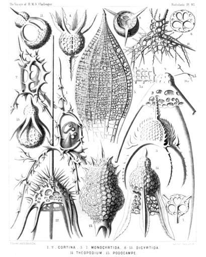 | Keywords: Radiolaria (Challenger) Plate 097.jpg follows <table> <tr> <td style text-align center; vertical-align top; colspan 3 >Plate 97 Stephanida Coronida Tripocalpida Phænocalpida Tripocyrtida Podocyrtida et Podocampida </td> </tr> <tr> <td style font-size 85 ; text-align right; vertical-align top; colspan 3 >Diam </td> </tr> <tr> <td style vertical-align top; >Fig 1 Cortina typus n sp </td> <td style vertical-align bottom; >×</td> <td style text-align right; vertical-align bottom; >300</td> </tr> <tr> <td style font-size 85 ; padding-left 3em; text-indent -1em; vertical-align top; >View from the right side The upper part of the central capsule includes the nucleus the lower part the podoconus besides some oil-globules The two pectoral feet are partly broken off </td> </tr> <tr> <td style vertical-align top; >Fig 2 Podocoronis cortiniscus n sp </td> <td style vertical-align bottom; >×</td> <td style text-align right; vertical-align bottom; >400</td> </tr> <tr> <td style font-size 85 ; padding-left 3em; text-indent -1em; vertical-align top; >View from the right anterior side </td> </tr> <tr> <td style vertical-align top; >Fig 3 Tripocalpis cortinaris n sp </td> <td style vertical-align bottom; >×</td> <td style text-align right; vertical-align bottom; >400</td> </tr> <tr> <td style vertical-align top; >Fig 4 Phænocalpis petalospyris n sp </td> <td style vertical-align bottom; >×</td> <td style text-align right; vertical-align bottom; >400</td> </tr> <tr> <td style font-size 85 ; padding-left 3em; text-indent -1em; vertical-align top; >Lateral view inverted </td> </tr> <tr> <td style vertical-align top; >Fig 5 Haliphormis lagena n sp </td> <td style vertical-align bottom; >×</td> <td style text-align right; vertical-align bottom; >200</td> </tr> <tr> <td style vertical-align top; >Fig 6 Halicapsa lithapium n sp </td> <td style vertical-align bottom; >×</td> <td style text-align right; vertical-align bottom; >300</td> </tr> <tr> <td style font-size 85 ; padding-left 3em; text-indent -1em; vertical-align top; >Basal view </td> </tr> <tr> <td style vertical-align top; >Fig 7 Peridium alatum n sp </td> <td style vertical-align bottom; >×</td> <td style text-align right; vertical-align bottom; >300</td> </tr> <tr> <td style font-size 85 ; padding-left 3em; text-indent -1em; vertical-align top; >Basal view </td> </tr> <tr> <td style vertical-align top; >Fig 8 Sethopilium orthopus n sp </td> <td style vertical-align bottom; >×</td> <td style text-align right; vertical-align bottom; >300</td> </tr> <tr> <td style font-size 85 ; padding-left 3em; text-indent -1em; vertical-align top; >Basal view </td> </tr> <tr> <td style vertical-align top; >Fig 9 Sethopilium macropus n sp </td> <td style vertical-align bottom; >×</td> <td style text-align right; vertical-align bottom; >400</td> </tr> <tr> <td style vertical-align top; >Fig 10 Amphiplecta acrostoma n sp </td> <td style vertical-align bottom; >×</td> <td style text-align right; vertical-align bottom; >400</td> </tr> <tr> <td style vertical-align top; >Fig 11 Sethopera tricostata n sp </td> <td style vertical-align bottom; >×</td> <td style text-align right; vertical-align bottom; >400</td> </tr> <tr> <td style vertical-align top; >Fig 12 Acanthocorys macroceras n sp </td> <td style vertical-align bottom; >×</td> <td style text-align right; vertical-align bottom; >200</td> </tr> <tr> <td style vertical-align top; >Fig 13 Sethophæna hexaptera n sp </td> <td style vertical-align bottom; >×</td> <td style text-align right; vertical-align bottom; >400</td> </tr> <tr> <td style vertical-align top; >Fig 14 Theopodium tricostatum n sp </td> <td style vertical-align bottom; >×</td> <td style text-align right; vertical-align bottom; >400</td> </tr> <tr> <td style vertical-align top; >Fig 15 Podocampe trictenota n sp </td> <td style vertical-align bottom; >×</td> <td style text-align right; vertical-align bottom; >500</td> </tr> </table> https //archive org/details/reportonradiolar00haecrich 1887 Ernst Haeckel 1834-1919 ; engravings by Adolf Giltsch 1852-1911 PD-old-auto-1923 1919 Report on the Radiolaria |