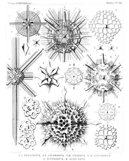 | Keywords: Radiolaria (Challenger) Plate 134.jpg follows <table> <tr> <td style text-align center; vertical-align top; colspan 3 >Plate 134 Dorataspida </td> </tr> <tr> <td style font-size 85 ; text-align right; vertical-align top; colspan 3 >Diam </td> </tr> <tr> <td style vertical-align top; >Fig 1 Dodecaspis tricincta n sp </td> <td style vertical-align bottom; >×</td> <td style text-align right; vertical-align bottom; >400</td> </tr> <tr> <td style font-size 85 ; padding-left 3em; text-indent -1em; vertical-align top; >The enclosed central capsule contains numerous spherical nuclei </td> </tr> <tr> <td style vertical-align top; >Fig 2 Lychnaspis minima n sp </td> <td style vertical-align bottom; >×</td> <td style text-align right; vertical-align bottom; >400</td> </tr> <tr> <td style font-size 85 ; padding-left 3em; text-indent -1em; vertical-align top; >Six-sided basal pyramid of an equatorial spine with the leaf-cross seen from the centre </td> </tr> <tr> <td style vertical-align top; >Fig 3 Zonaspis cingulata n sp </td> <td style vertical-align bottom; >×</td> <td style text-align right; vertical-align bottom; >400</td> </tr> <tr> <td style font-size 85 ; padding-left 3em; text-indent -1em; vertical-align top; >Equatorial section through the central capsule n nuclei; g yellow bodies intracapsular xanthellæ </td> </tr> <tr> <td style vertical-align top; >Fig 4 Zonaspis cingulata n sp </td> <td style vertical-align bottom; >×</td> <td style text-align right; vertical-align bottom; >800</td> </tr> <tr> <td style font-size 85 ; padding-left 3em; text-indent -1em; vertical-align top; >Central pyramidal base of an equatorial spine with the leaf-cross </td> </tr> <tr> <td style vertical-align top; >Fig 5 Stauraspis cruciata n sp </td> <td style vertical-align bottom; >×</td> <td style text-align right; vertical-align bottom; >400</td> </tr> <tr> <td style font-size 85 ; padding-left 3em; text-indent -1em; vertical-align top; >Central union of the radial spines three polar spines being taken off </td> </tr> <tr> <td style vertical-align top; >Fig 6 Lychnaspis longissima n sp </td> <td style vertical-align bottom; >×</td> <td style text-align right; vertical-align bottom; >400</td> </tr> <tr> <td style vertical-align top; >Fig 7 Lychnaspis minima n sp </td> <td style vertical-align bottom; >×</td> <td style text-align right; vertical-align bottom; >400</td> </tr> <tr> <td style font-size 85 ; padding-left 3em; text-indent -1em; vertical-align top; >Five-sided basal pyramid of a tropical spine with the leaf-cross seen from the centre </td> </tr> <tr> <td style vertical-align top; >Fig 8 Lychnaspis minima n sp </td> <td style vertical-align bottom; >×</td> <td style text-align right; vertical-align bottom; >400</td> </tr> <tr> <td style font-size 85 ; padding-left 3em; text-indent -1em; vertical-align top; >Six-sided basal pyramid of a polar spine with the leaf-cross seen from the centre </td> </tr> <tr> <td style vertical-align top; >Fig 9 Icosaspis elegans n sp </td> <td style vertical-align bottom; >×</td> <td style text-align right; vertical-align bottom; >400</td> </tr> <tr> <td style font-size 85 ; padding-left 3em; text-indent -1em; vertical-align top; >An isolated polar plate </td> </tr> <tr> <td style vertical-align top; >Fig 10 Icosaspis cruciata n sp </td> <td style vertical-align bottom; >×</td> <td style text-align right; vertical-align bottom; >400</td> </tr> <tr> <td style font-size 85 ; padding-left 3em; text-indent -1em; vertical-align top; >An isolated equatorial plate </td> </tr> <tr> <td style vertical-align top; >Fig 11 12 Dorataspis species </td> <td style vertical-align bottom; >×</td> <td style text-align right; vertical-align bottom; >100</td> </tr> <tr> <td style font-size 85 ; padding-left 3em; text-indent -1em; vertical-align top; >Diagram of the composition of the shell of twenty plates and also of the central union of the basal leaf-cross </td> </tr> <tr> <td style font-size 85 ; padding-left 3em; text-indent -1em; vertical-align top; >Fig 11 Oblique equatorial aspect </td> </tr> <tr> <td style font-size 85 ; padding-left 3em; text-indent -1em; vertical-align top; >Fig 12 Accurate polar aspect compare p 804 805 </td> </tr> <tr> <td style vertical-align top; >Fig 13 Coscinaspis isopora n sp </td> <td style vertical-align bottom; >×</td> <td style text-align right; vertical-align bottom; >400</td> </tr> <tr> <td style font-size 85 ; padding-left 3em; text-indent -1em; vertical-align top; >An isolated equatorial plate with two aspinal and six coronal pores </td> </tr> <tr> <td style vertical-align top; >Fig 14 Coscinaspis isopora n sp </td> <td style vertical-align bottom; >×</td> <td style text-align right; vertical-align bottom; >400</td> </tr> <tr> <td style font-size 85 ; padding-left 3em; text-indent -1em; vertical-align top; >Two isolated tropical plates b northern; d southern each with two aspinal and five coronal pores </td> </tr> <tr> <td style vertical-align top; >Fig 15 Diporaspis nephropora n sp </td> <td style vertical-align bottom; >×</td> <td style text-align right; vertical-align bottom; >400</td> </tr> <tr> <td style vertical-align top; >Fig 16 Acontaspis hastata n sp </td> <td style vertical-align bottom; >×</td> <td style text-align right; vertical-align bottom; >400</td> </tr> </table> https //archive org/details/reportonradiolar00haecrich 1887 Ernst Haeckel 1834-1919 ; engravings by Adolf Giltsch 1852-1911 PD-old-auto-1923 1919 Report on the Radiolaria |