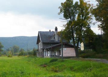 Keywords: Radkow train station.jpg en Abolished train station in Radków Stolových hor Trať do Střední Stěnavy se stáčela vlevo rovně pokračovala vlečka vedoucí směrem k dodnes existujícímu závodu na zpracování pískovce těženého na severních svazích Stolových hor own JanSuchy 2010-09-18 50 30 9 508 N 16 24 13 094 E heading S Radków Railway line 327 Poland Former Owl Mountains Railway