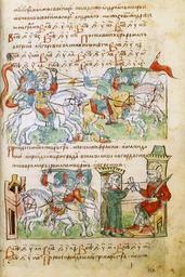 | Keywords: RadzivillChronicleFol21r.jpg Радзивилловская летопись л 21r иниатю ы Mиниатю а п едставляет битва болга ского ца я Симеона с византийцами 914 или война Иго я с печенегами наве ху Tекст из Радзивиловской летописи а болга е со г екы ступишася и пе есечени быша г екы Симеон же п иа г ад Онд ень а Иго е воеваше на печенеги см также Х оника Гео гия Ама тола; Ист ин В Книгы в еменыя и об азныя Гео гия ниха Х оника Гео гия Ама тола в д евнем славяно усском пе еводе http //ksana-k narod ru/kodex/amartol html Т 1 Текст исслед и слова ь Пг 1920 ст 545-546; Иванова Кл иколова Св Тъ жество на Словото Златният Век на Бълга ската Книжнина http //www kroraina com/knigi/zv/zv6_5 html VI Летописни тво би Гео ги Ама атол В еменник Поход болга ского ца я Симеона на Ца ыг ад 922-924 и заключение ми а с импе ато ом Романом I внизу Tекст из Радзивиловской летописи П ииде Семион на Ца ыг ад и поплени Ф акию и акидонию и п ииде ко Ца юг аду в силе велице и в го дости и сотво и ми с Романом ца ем Лите ату а Кукушкина Радзивиловская летопись Текст Исследование Описание миниатю ст 310 Igors's gegen die Petschenegen oben Text aus der Radziwiłł-Chronik die Bulgaren aber schlugen sich mit den Griechen und die Griechen wurden niedergemacht Simeon aber nahm die Stadt Ondren ein Igor führte Krieg gegen die Petschenegen Graßhoff Freydank Sturm Rauchspur der Tauben Radziwiłł-Chronik S 51 Zar Simeon's Feldzug gegen Konstantinopel 922-924 und Abschluss eines Friedensvertrages mit dem byzantinischen Kaiser Romanos unten Text aus der Radziwiłł-Chronik Simeon zog gegen Zargrad und verheerte Thrakien und Makedonien; mit einer großen Streitmacht und voller Stolz rückte er vor Zargrad und schloß Frieden mit dem Kaiser Romanos und kehrte dann wieder zurück Graßhoff Freydank Sturm Rauchspur der Tauben Radziwiłł-Chronik S 51 en Radziwiłł Chronicle from the Middle Ages unknown century 15 <gallery> File RadzivillChronicleFol21ra jpg File RadzivillChronicleFol21rb jpg </gallery> PD-Art Radzivill Chronicle Romanos I Lekapenos Simeon I of Bulgaria Bulgarians in Medieval art Sieges of Constantinople Igor the Old in miniature Pechenegs |