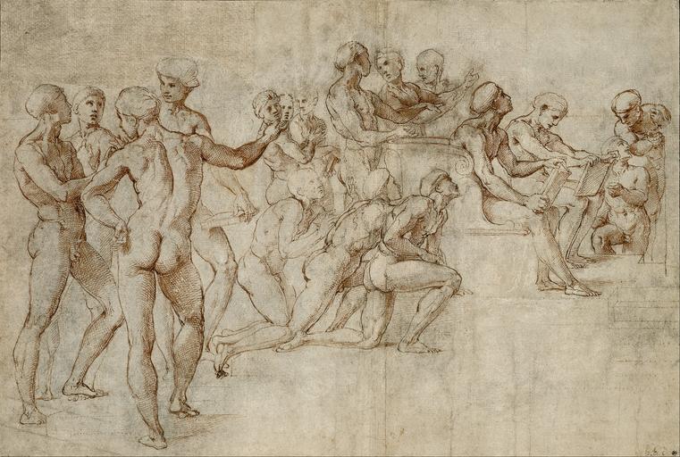 | Keywords: Raffael (Raffaello Santi) - Sketch for the lower left section of the "Disputa" - Google Art Project.jpg  commons artist commons date commons medium commons dimensions commons institution Institution Städel commons location commons references commons object_history commons exhibition_history commons credit_line commons inscriptions commons notes commons accession_number commons source commons permission commons other_versions commons zoom core title Sketch for the lower left section of the Disputa core creator Raffael Raffaello Santi core date dateCreated 1508/1509 core format w416 x h281 mm Complete core type Paper partly enlarged core rights Städel Museum “ U Edelmann “ Artothek core relation http //www staedelmuseum de/sm/index php StoryID 1076 ObjectID 465 art artist_birth_place Urbino art artist_nationality Italian art artist_death_place Rom art artist_date 1483/1520 c-057077c9 customtext null Pen and brwon ink sections of the outlines pricked c-057077c9 customtext null_source Städel Museum c-057077c9 customtext null_extent Complete google display_date 1508/1509 google is_artproject TRUE google is_gigapixel FALSE google is_secured TRUE google partner/id 00000000057077c9 google picasa_token I1nwXVlfy_scgWfVtQrmDugVedk special url_id HAGIKdb_HCCK8Q google partner/name Städel Museum special partner/name_no_lang Städel Museum PD-old-100-1923 1520 Google Art Project works by Raphael Raffaello Sanzio Drawings in the Städel Raphael's Disputation of the Holy Sacrament |