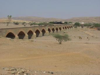| Keywords: Railbridge Obel river.JPG en 14-arch Railbridge over Obel river Eritrea On the right hand side Foundations of predecessing rail bridge de 14-Bogen-Eisenbahnbrücke über den Obel Eritrea Rechts Fundamente der Vorgängerbrücke own Reinhard Dietrich 01 10 2011 Cc-zero Railway bridges in Eritrea Railway coaches of Eritrea Stone arch railway bridges Narrow gauge bridges Rivers of Eritrea | ||||