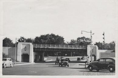 | Keywords: kalamazoo public library michigan history photography railroad automobile riverview road street drive avenue bridge streetlights underpass outdoor Railroad underpass at East Michigan Avenue and Riverview Drive, 1937-1941. Several cars are visible, traveling under the bridge. Camera faces northeast. Streetlights and train signals are also visible.   KPL catalogue number P-804. Railroad underpass at East Michigan Avenue and Riverview Drive, 1937-1941. Several cars are visible, traveling under the bridge. Camera faces northeast. Streetlights and train signals are also visible.   KPL catalogue number P-804.  |
