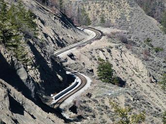 Keywords: train tracks winding canyon fraser river canyon dry hot british columbia canada valley river rocks