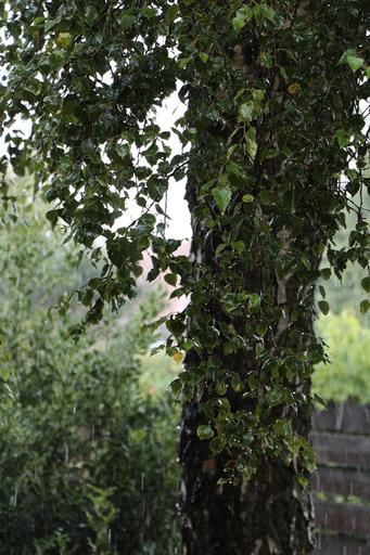 Keywords: rain birch tree nature raindrop drip wet tribe log leaves birch trunk green water bark