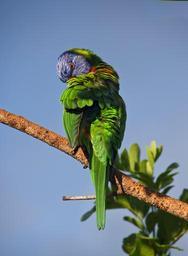 Keywords: rainbow lorikeet parrot preening colourful bird australian wild tree blue sky