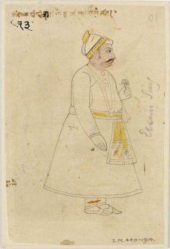 | Keywords: Raja Ishwari Singh of Jaipur.png en Drawing in ink with patches of watercolour on paper depicting Raja Ishwari Singh of Jaipur 1744-1751 son of Jai Singh II standing facing right holding a rose in his left hand http //collections vam ac uk/item/O405231/raja-ishwari-singh-of-jaipur-drawing-unknown/ Raja Ishwari Singh of Jaipur author century 19 PD-old-100 Uncategorized 2014 August 31 | ||||