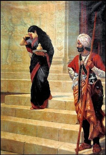 | Keywords: Raja Ravi Varma, Sairandhri (1891).jpg Artwork Creator Raja Ravi Varma Sairandhri w Draupadi disguised as Sairandhri going to the court of Keechaka carrying milk and honey സൈരന്ധ്രിയായ വി ദ്രൗപദി പാലും തേനുമായി ക ചകന്റെ സദസ്സിലേയ്ക്ക് പോകുന്നു 1891 Oil on canvas Bombay Arts Society Dept of Archeology and Museum w Mumbai Maharashtra ബോംബെ ആർട്സ് സൊസൈറ്റി വി മുംബൈ മഹാരാഷ്ട്ര object history credit line accession number http //www museumsyndicate com/item php item 25540 <gallery>File Raja_Ravi_Varma _Pleasing jpg </gallery> Malayalam loves Wikimedia event 2011 April PD-Art-100 Depiction of scenes from the Mahabharata by Raja Ravi Varma Draupadi Soldiers of India in art 1891 paintings by Raja Ravi Varma |