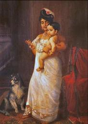 Keywords: Raja Ravi Varma, There Comes Papa (1893).jpg Artwork Creator Raja Ravi Varma en There Comes Papa Mavelikkara Raja Ravi Varma 's daughter holding her son Marthanda Varma മാതൃകയാക്കിയിരിക്കുന്നത് സ്വന്തം പുത്രിയായ മഹാപ്രഭ തമ്പുരാട്ടിയെ ആണ് മൂത്ത മകനായ മാർത്താണ്ഡ വർമ്മയാണ് മഹാപ്രഭ തമ്പുരാട്ടിയുടെ കൈയ്യിൽ 1893-ൽ രചിച്ച ചിത്രം 1893 Oil on canvas Kowdiar Palace Thiruvananthapuram Kerala India object history credit line accession number Not stated by uploader PD-old-100 Sethu Lakshmi Bayi Paintings of children of India Portraits of women of Kerala by Raja Ravi Varma Portraits of children of India by Raja Ravi Varma Mundum Neriyathum Art of India in the Kowdiar Palace People with animals in art of India 19th-century paintings of dogs 1893 paintings by Raja Ravi Varma Mothers and children in art of India Paintings of women with dogs |