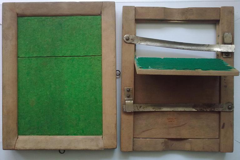 | Keywords: Ramki-do-fotografii-stykowej.jpg en Wooden frames for contact prints on chloride paper; 30's of 20th century pl Ramki do naświetlania odbitek stykowych formatu dużej pocztówki - widok z przodu i z tyłu Wykorzystywane w latach 30 XX wieku Dzięki zamocowanej na zawiasach klapie z miękkim filcowym podłożem do ramki można było włożyć negatyw na szkle i chlorowy papier do odbitek stykowych a następnie po zamknięciu klapy i domknięciu metalowymi sprężynującymi dźwigniami uzyskiwano dokładny i trwały docisk emulsji papieru do emulsji negatywu Tak zamkniętą ramkę można było bezpiecznie wynieść z ciemni na światło bez ryzyka wzajemnego przemieszczenia papieru względem negatywu Po naświetleniu w tej technologii zazwyczaj co najmniej kilkuminutowym papieru chlorowego poprzez szklany negatyw całość ponownie przenoszono do ciemni gdzie papier poddawano procesowi chemicznego wywołania obrazu utajonego powstałego po naświetleniu a następnie utrwalenia tego obrazu own Julo 2010-04-23 Julo Photography accessories |