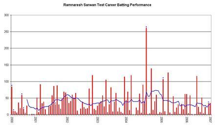 | Keywords: Ramnaresh Sarwan graph.png Test Match performance of Ramnaresh Sarwan It was created by Raven4x4x The red bars indicate the player's test match innings while the blue line shows the average of the ten most recent innings at that point Note that this average cannot be calculated for the first nine innings The blue dots indicate innings in which Sarwan finished not-out This graph was generated with Microsoft Excel 2002 using data from Cricinfo http //stats cricinfo com/statsguru/engine/player/52969 html class 1;orderby start;template results;type batting;view innings and Howstat http //www howstat com au/cricket/Statistics/Players/PlayerProgressBat asp PlayerID 2220 The information in this chart is current as of 28 January 2008 2008-1-28 Own <br />Transferred from http //en wikipedia org en wikipedia Raven4x4x at http //en wikipedia org en wikipedia en wikipedia Raven4x4x original upload log page en wikipedia Ramnaresh_Sarwan_graph png 2008-01-28 00 57 Raven4x4x 986×574 5354 bytes <nowiki>This graph details the Test Match performance of Ramnaresh Sarwan It was created by Raven4x4x The red bars indicate the player's test match innings while the blue line shows the average of the</nowiki> DEFAULTSORT Sarwan Ramnaresh 1980 births Cricket in England West Indies Test cricketers Test cricketers graphs of India |