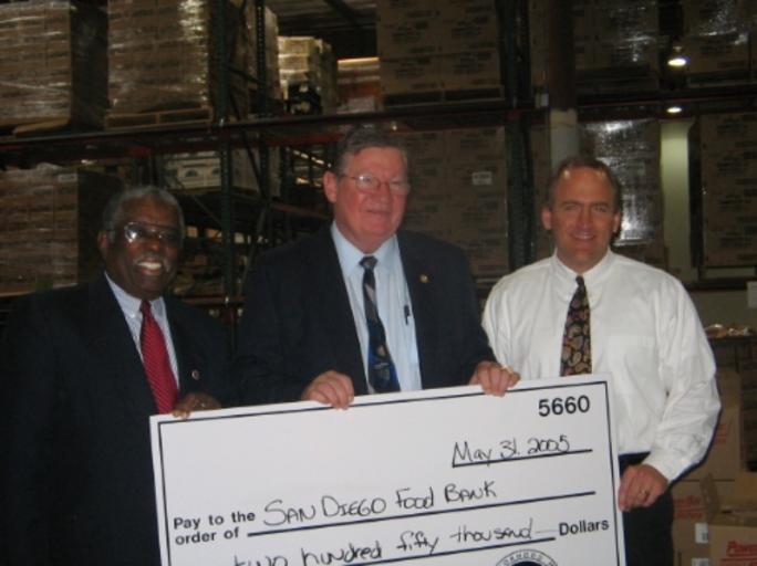 | Keywords: Randy-Cunningham-money.jpg Photo United States House of Representatives - http //cunningham house gov/Photos/ PhotoID 28862 Congressman Randy Duke Cunningham presented a check to the San Diego Food Bank for federal funding secured for the Building Against Hunger campaign The funding will assist the Food Bank to purchase and fully equip a new central warehouse and distribution center The new facility will be used to accept additional donated products provide more nutritious meals increase the volume of food distributed and increase services to more hungry residents throughout San Diego County PD-USGov May 2005 in the United States 2005 in San Diego Duke Cunningham Food banks Oversized cheques |