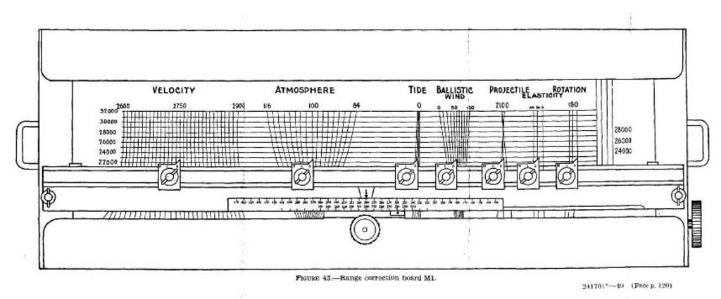 | Keywords: Range correction board.jpg  en A rendering of the face of a range correction board a desktop device somewhat like a large old-fashioned mechanical adding machine that was used to cummulate the corrections needed to account for various factors influencing the range of shells fired by the Coast Artillery FM 4-15 Coast Artillery Field Manual-Seacoast Artillery Fire Control and Position Finding US War Department Rendering is from FM 4-15 Coast Artillery Field Manual-Seacoast Artillery Fire Control and Position Finding U S War Department Government Printing Office Washington 1940 following p 120 PD-USGov Original upload log en wikipedia ftcg page en wikipedia Range_correction_board jpg wikitable - 17 27 10 June 2010 858 × 356 61 422 bytes Pgrig w en <nowiki>A rendering of the face of a range correction board a desktop device somewhat like a large old-fashioned mechanical adding machine that was used to cummulate the corrections needed to account for various factors influencing the range of shells fired b</nowiki> Uncategorized 2014 January 13 |