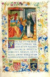 | Keywords: Ransanus corvina Mátyás és Beatrix.jpg hu Petrus Ransanus nápolyi követ beszédet mond Mátyás és Beatrix előtt - miniatúra 1480-as évek vége A Ransanus - Corvina 1490 és 1492 között Nápolyban készült Szerzője Ransanus 1488-ban a Nápolyi Királyság követeként érkezett Budára A miniatúra alatt II Ulászló és Bakócz Tamás esztergomi érsek címere látható 1492 http //elib kkf hu/hungary/magyar/history/pictures/10-11Corvina jpg Ransanus other versions PD-old-100 Uploaded with UploadWizard Bibliotheca Corviniana Coats of arms of Tamás Bakócz |