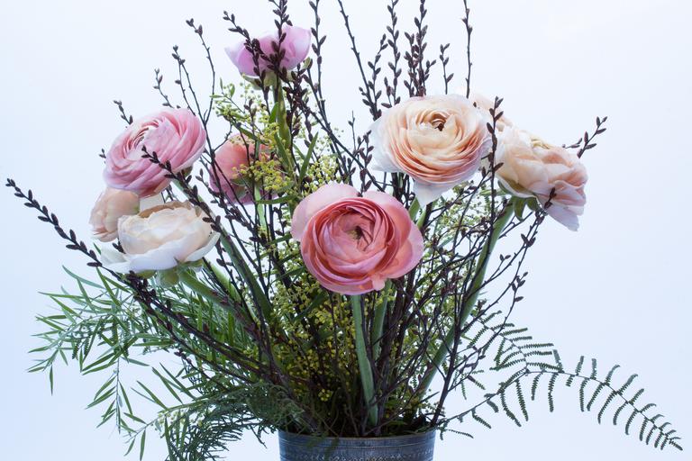 Keywords: ranunkeln flowers spring nature plant pastellfarben salmon pink hahnenfußgewächs ranunculaceae bouquet mimosa coral fern
