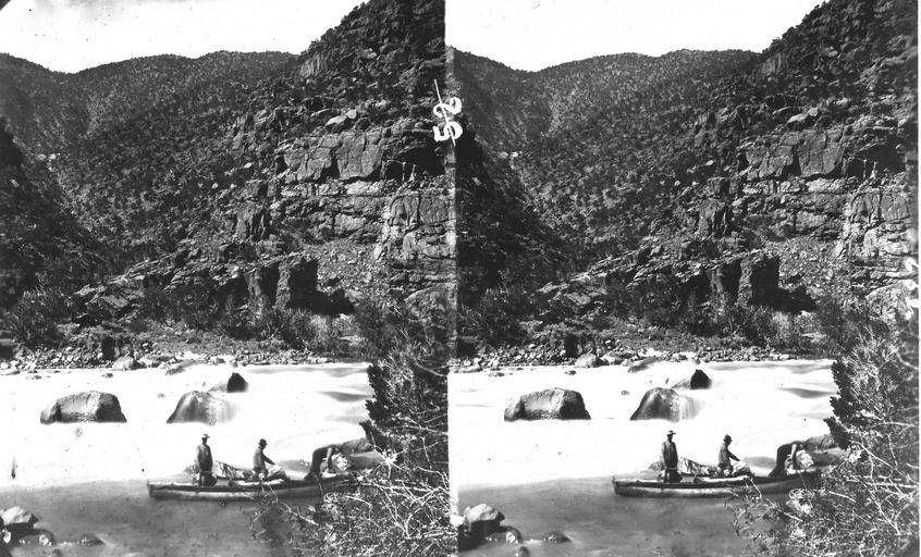 | Keywords: stereoscopic stereophotography stereophotographs historical usgs history geology mapping black and white blackandwhite bnw stereograph blackandwhite monochrome outdoor black and white Rapid at Canyon of Lodore, Green River. Head of Hell's Half Mile. Jones, Hillers, and Dellenbaugh in the Emma Dean at foot of rapid. Dinosaur National Monument. Moffat County, Colorado. June 1871. (Stereoscopic view) Published as illustration no. 5 in Darrah, W. C. Powell of the Colorado. Princeton University Press, 1951. Rapid at Canyon of Lodore, Green River. Head of Hell's Half Mile. Jones, Hillers, and Dellenbaugh in the Emma Dean at foot of rapid. Dinosaur National Monument. Moffat County, Colorado. June 1871. (Stereoscopic view) Published as illustration no. 5 in Darrah, W. C. Powell of the Colorado. Princeton University Press, 1951. |