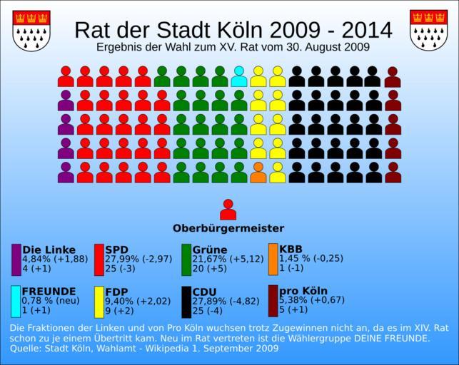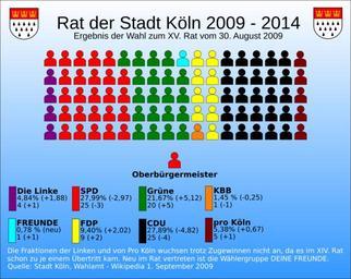 | Keywords: RatKöln2009.svg Cologne in Northrhine-Westfalia as elected on the 30th August 2009 Köln in Nordrhein-Westfalen wie er am 30 August 2009 gewählt wurde own Vinom 2009-09-01 thumb Vorgänger Zusammensetzung des XIV Rates gegen Ende der Amtsperiode Rat der Stadt Köln Local elections in Cologne 2009 |