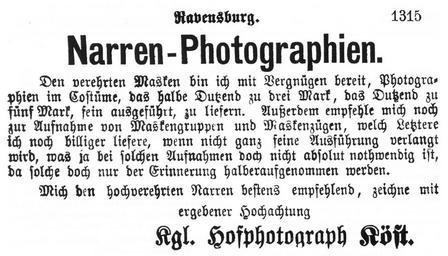 Keywords: Ravensburg Fastnacht 1876 Photograph Köst.jpg Ravensburg Anzeige im Oberschwäbischen Anzeiger 19 Jh Hofphotograf Köst bietet Narren-Photographien an Beate Falk Chronik der Ravensburger Fasnacht 1353 “1968 in Albert Schmid Hrsg Fasnacht in Ravensburg Ein Streifzug von 1353 bis heute Oberschwäbische Verlags-Anstalt Ravensburg 2000 ISBN 3-926891-25-4 S 89 wohl 1876 Bildnachweis ist nicht ganz eindeutig interpretierbar 1876 author PD-old-70-1923 History of carnival in Ravensburg History of photography Josef Köst |