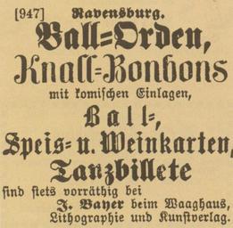 Keywords: Ravensburg Fastnacht 1878 Orden Bonbons Karten.jpg Ravensburg Anzeige im Oberschwäbischen Anzeiger 19 Jh Anzeige von J Bayer beim Waaghaus Lithograph Joseph Bayer über Ball-Orden Knall-Bonbons etc Beate Falk Chronik der Ravensburger Fasnacht 1353 “1968 in Albert Schmid Hrsg Fasnacht in Ravensburg Ein Streifzug von 1353 bis heute Oberschwäbische Verlags-Anstalt Ravensburg 2000 ISBN 3-926891-25-4 S 89 wohl 1878 Bildnachweis ist nicht ganz eindeutig interpretierbar 1878 Creator Joseph Bayer PD-old-100 History of carnival in Ravensburg Joseph Bayer |