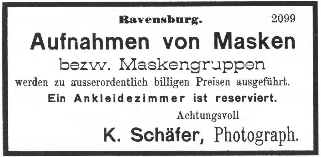 Keywords: Ravensburg Fastnacht 1886 Photograph Schäfer 1.jpg Ravensburg Anzeige im Oberschwäbischen Anzeiger 19 Jh Photograph K Schäfer bietet Aufnahmen von Masken und Maskengruppen an Beate Falk Chronik der Ravensburger Fasnacht 1353 “1968 in Albert Schmid Hrsg Fasnacht in Ravensburg Ein Streifzug von 1353 bis heute Oberschwäbische Verlags-Anstalt Ravensburg 2000 ISBN 3-926891-25-4 S 89 wohl 1886 Bildnachweis ist nicht ganz eindeutig interpretierbar 1886 author PD-old-70-1923 History of carnival in Ravensburg History of photography |