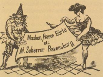 Keywords: Ravensburg Fastnacht 1890 Masken Nasen Bärte.jpg Ravensburg Anzeige im Oberschwäbischen Anzeiger 19 Jh Masken Nasen Bärte etc M Scherrer Ravensburg Beate Falk Chronik der Ravensburger Fasnacht 1353 “1968 in Albert Schmid Hrsg Fasnacht in Ravensburg Ein Streifzug von 1353 bis heute Oberschwäbische Verlags-Anstalt Ravensburg 2000 ISBN 3-926891-25-4 S 89 wohl 1890 Bildnachweis ist nicht ganz eindeutig interpretierbar 1890 author PD-old-70-1923 History of carnival in Ravensburg |