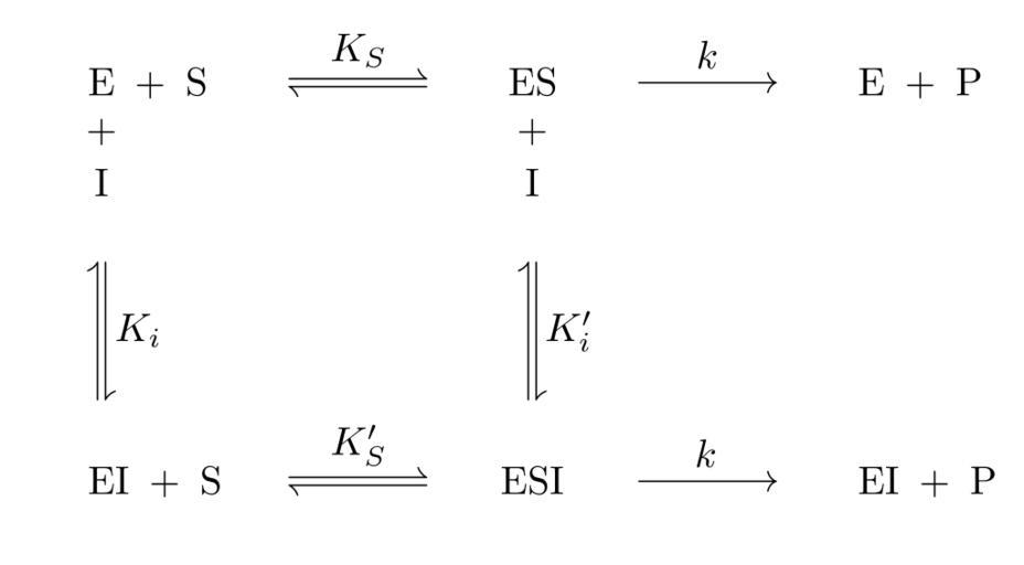 Keywords: Reaction scheme enzyme inhibition 2.svg Reaktionsschema einer Enzymhemmung mit Gleichgewichtskonstanten Reaction scheme of an enzyme inhibition with equilibrium constants LangSwitch E enzyme<br /> S substrate<br /> P product<br /> I inhibitor<br /> ES enzym substrat complex<br /> EI enzym inhibitor complex<br /> ESI enzym substrat inhibitor complex<br /> E Enzyme<br /> S Substrate<br /> P Produkt<br /> I Inhibitor<br /> ES Enzym-Substrat-Komplex<br /> EI Enzym-Inhibitor-Komplex<br /> ESI Enzym-Substrat-Inhibitor-Komplex<br /> Own 2010-09-12 Sponk <span class signature-talk >talk</span> Reaction scheme enzyme inhibition 1 svg<br /> Reaction scheme competitive enzyme inhibition svg<br /> Reaction scheme non-competitive enzyme inhibition svg<br /> Reaction scheme uncompetitive enzyme inhibition svg Enzyme kinetics Equilibrium constant |