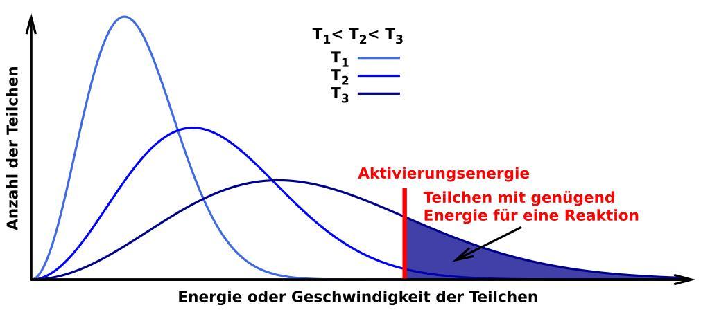 | Keywords: Reaktionsgeschwindigkeit-Temperatur2.svg de Abhängigkeit der Reaktionsgeschwindigkeit von der Temperatur 2014-07-13 13 31 48 v reset set terminal svg size 1600 700 enhanced font 'sans-serif bold 27' lw 5 set output 'maxboltz svg' set key top center title 'T_1 < T_2 < T_3' set border 3 set xrange 0 7 set samples 1000 unset tics set xlabel 'Energie oder Geschwindigkeit der Teilchen' set ylabel 'Anzahl der Teilchen' f x T x 2 exp - x 2 / T / T 3 /2 Xa 4 T1 1 T2 3 T3 7 set arrow from graph 75 2 to graph 65 075 front set arrow from Xa 0 to Xa f Xa T3 + 04 nohead front lc rgb 'red' lw 2 set arrow to 0 graph 1 front set arrow to graph 1 01 0 front set label 'Aktivierungsenergie' at Xa- 5 f Xa T3 + 06 textcolor rgb 'red' set label sprintf Teilchen mit genügend\nEnergie für eine Reaktion at graph 6 31 textcolor rgb 'red' set style fill solid 75 noborder plot f x T1 title 'T_1' lc rgb 'royalblue' \ f x T2 title 'T_2' lc rgb 'blue' \ f x T3 title 'T_3' lc rgb 'dark-blue' \ Xa<x x < 7 f x T3 1/0 w filledcurves x1 notitle lc rgb 'dark-blue' unset output own StefanPohl cc-zero Grafikwerkstatt Uploaded with UploadWizard Chemical kinetics |