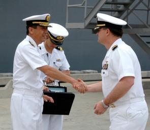 | Keywords: Rear Adm. Chikara Inoue shakes hands with Capt. Dennis Mikeska at San Diego, -8 May 2008 a.jpg U S Navy Capt Dennis Mikeska right shakes hands and presents a command coin to Japanese Maritime Self-Defense Force Rear Adm Chikara Inoue commander Japan Training Squadron at Naval Base San Diego Calif May 8 2008 The Japan Maritime Self-Defense Force training ships Kashima TV-3508 and Asagiri TV 3516 and the destroyer Umigiri DD-158 will be in San Diego for a scheduled port visit and for training 080508-N-XO897-015 Navy http //www defenseimagery mil/imagery html guid 066e95ebbe165434840f4e3492609feda7dd15eb 2008-05-08 Mass Communication 2nd Class Alexis R Brown U S Navy PD-USGov-Military-Navy Admirals of the JMSDF International guests at Naval Base San Diego Handshakes involving the military 2008 Japanese Maritime Self-Defense Force Training Squadron |