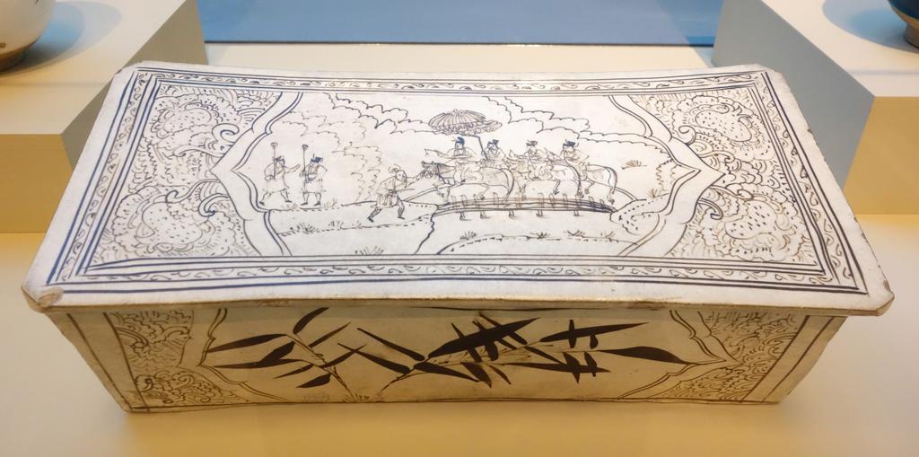 | Keywords: Rectangular pillow with figures in landscape, China, Hebei province, approx. 1100-1234 AD (Song, Liao, or Jin dynasties), ceramic with white slip, clear glaze, overglaze- Asian Art Museum of San Francisco - DSC01353.JPG en Exhibit in the Asian Art Museum of San Francisco San Francisco California USA This artwork is in the public domain because the artist died more than 70 years ago Photography was permitted in the museum without restriction 2013-11-05 20 14 39 own Daderot other versions cc-zero Ceramic pillows in the Asian Art Museum of San Francisco Uploaded with UploadWizard |