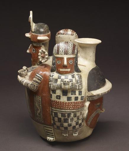 | Keywords: Recuay - Effigy Bottle - Walters 20092037 - Right Side.jpg Northern Peru's pottery traditions focus on three-dimensionality the vessels often modeled into a variety of volumetric forms depicting human figures fruits or vegetables and even architecture The coastal Moche and their highland Recuay neighbors were masters of the modeled form having explored and perfected this tradition whose origins reach back as much as a thousand years among cultures of the Early Horizon 900 -200 BCE Recuay pottery is typically thin-walled and made from a kaolin-based clay Vessels are decorated with negative-resist and positive slip painting as well as an unusual post-fire resist black organic pigment The varied resist-painting techniques allowed Recuay artists to create complex design fields on the positive slip-painted backgrounds Recuay art and especially its narrative pottery features the Andean concepts of dualism and reciprocity as key universal facets Emphasis was placed on dyads such as male-female which is aptly expressed by this extraordinary figural bottle A finely dressed noble woman stands at opposing sides of the four-sided vessel while a male personage flanks the other two faces The males pertain to a second dyad of warrior and captive the latter represented as a trophy head rather than a full figure The women and warrior cradle qero-like ceremonial cups in their hands; the male figure also clutches a war club in his right hand His fine clothing and headdress identify him as a member of the ruling class The iconic face in his headdress recalls depictions of ancestors and cult figures as prime shamanic beings that often adorn the heads of authority figures from earliest times throughout Peru Considered together this four-sided figural vessel embodies the Andean ideology of war and sacrifice to ensure the earth's fertility and maintain universal balance The taking of captives for ritual sacrifice was facilitated by the victor's shamanic power here implied by the male figure's headdress As elsewhere in ancient Peru this ceremonial pageant was a sacred necessity and the responsibility of the nobility It is reflected in stone sculptures from the Recuay area the highland Callejón de Huaylas region which feature small trophy heads and larger male figures carrying clubs shields or decapitated heads The Recuay tradition of public stone sculptures portraying women echoes their depictions on pottery vessels signaling the importance of female participants in both ritual and political events 200 BC-AD 500 Early Intermediate earthenware slip paint cm 28 26 20 57 accession number 2009 20 37 80192 Michael Robins date and mode of acquisition unknown John G Bourne date and mode of acquisition unknown Walters Art Museum Gift of John Bourne 2009 place of origin Northern Highlands Walters Art Museum license Pre-Columbian art in the Walters Art Museum Recuay pottery Media contributed by the Walters Art Museum needs category review |