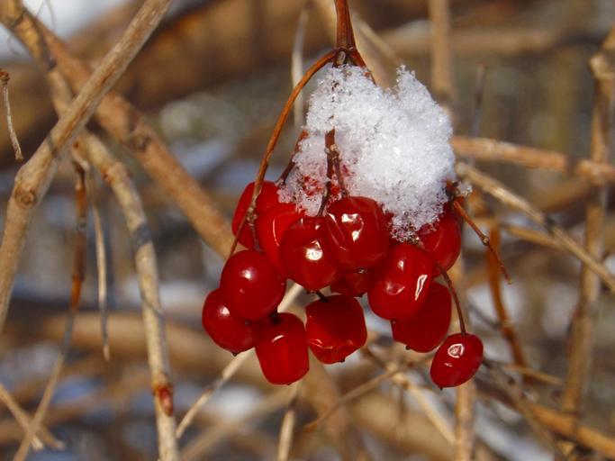 Keywords: red fruit winter snow ice bush shrub depth of field outdoor Cluster of berries with snow on top Cluster of berries with snow on top