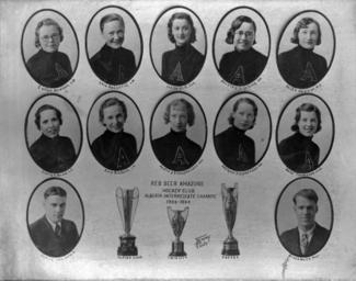 Keywords: hockey alberta ice hockey icehockey blackandwhite monochrome text black and white Red Deer Amazons Hockey Club, Alberta Intermediate champs 1933-1934. Top row (left to right): Evelyn Hewson, Lois Botterill, Irene Dell, Doroth Kitching, Helen Hayhoe. Middle row (left to right): Evelyn Bond, Evie Nicholls, Audrey Stephenson, Adelyne Stephenson, "Babe" Thompson. Bottom row (left to right): "Scotty" Lee (coach), Ernie Wells (manager). A12902. Red Deer Amazons Hockey Club, Alberta Intermediate champs 1933-1934. Top row (left to right): Evelyn Hewson, Lois Botterill, Irene Dell, Doroth Kitching, Helen Hayhoe. Middle row (left to right): Evelyn Bond, Evie Nicholls, Audrey Stephenson, Adelyne Stephenson, "Babe" Thompson. Bottom row (left to right): "Scotty" Lee (coach), Ernie Wells (manager). A12902. |