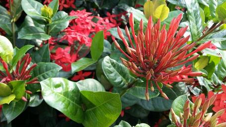 Keywords: red flowers flowering ixora cultivar green leaves petals flora plant flower red nature green botany plants flower garden foliage summer field bouquet summer flowers flower bud flower buds colors bloom wallpaper