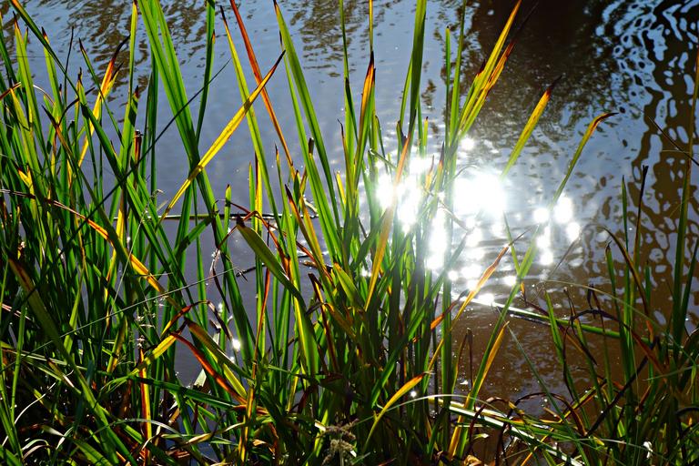 Keywords: reed rush plant bank waterway water sunlight sparkle glitter