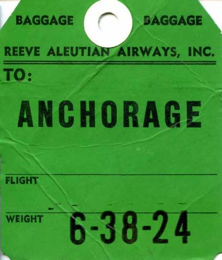 Keywords: Reeve Aleutian bag tag ANC front.jpg en USA Reeve Aleutian Airways green bag tag front with destination Anchorage in use in 1972 own work from scan Piergiuliano Chesi 2012-06-18 Bag tags Reeve Aleutian Airways