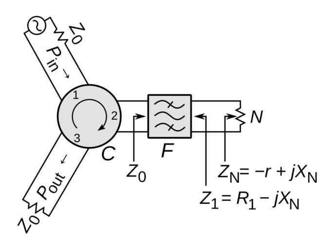 | Keywords: Reflection amplifier.svg reflection amplifier which uses a negative resistance diode such as a tunnel diode Gunn diode or IMPATT diode to provide gain A one-port negative resistance device like a diode can amplify but the amplified output signal must pass out of the device through the same pair of terminals as the input signal passes in so without some way of separating the signals the amplifier can suffer from feedback problems The reflection amplifier uses a nonreciprocal device called a circulator to separate the signals The circulator C is a solid state component with three ports which passes signals in circular order; a signal applied to port 1 is sent to port 2 and similarly 2 to 3 and 3 to 1 In this reflection amplifier the input signal P<sub>in</sub> is applied to port 1 a DC-biased negative resistance diode N is attached to port 2 through a filter F and the output P<sub>out</sub> taken from port 3 The input signal is sent from port 1 to the diode at port 2 but the returning amplified signal from the diode is routed to port 3 so there is little coupling from output to input The purpose of the filter F is to present the correct impedance to the diode which determines the amplifier's gain Since diodes have significant reactance capacitance X<sub>N</sub> at high frequencies the filter also cancels this reactance with a conjugate reactance to prevent reflections 2014-07-30 17 36 03 own Chetvorno cc-zero Uploaded with UploadWizard SVG electricity Circulator circuits Negative resistance |