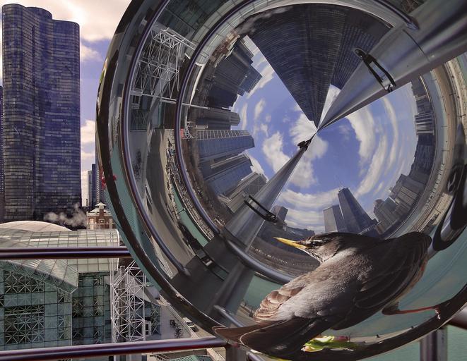 Keywords: reflection city bird architecture distortion assembly graphics high houses skyscrapers chicago metal construction zenith the background wallpaper decoration hint circle fisheye wide angle lens