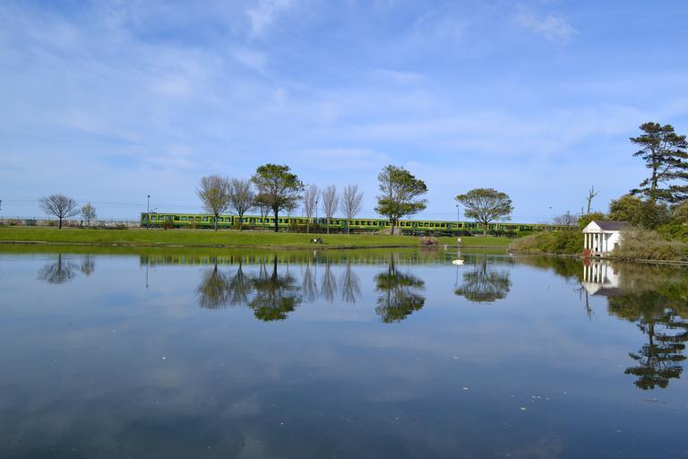 Keywords: reflection pond train green blue peaceful water calm peace sunny ireland view