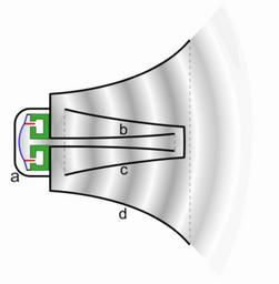 | Keywords: Reflex loudspeaker animation 2.gif folded horn speaker widely used in public address systems It consists of a specialized diaphragm loudspeaker called a compression driver a attached to a metal or plastic horn d The driver has a small metal diaphragm <font color blue > blue </font> driven to vibrate by the audio signal current flowing through a coil of wire <font color red > red </font> between the poles of a cylindrical magnet <font color green > green </font> The horn serves to couple the diaphragm more efficiently to the air allowing it to radiate more of its energy as sound than a conventional horn speaker making it louder The horn sound path must be several feet long so to make the speaker more compact the sound path is folded into a zigzag shape by several concentric exponentially-widening ducts The sound waves pass forward through an inner tube b in the central projection in the horn back through a larger concentric tube c then out through the surrounding horn d <br /><br /> Reentrant loudspeakers can be 10 times as efficient as cone loudspeakers and so their output can be 10 dB louder when operating from the same amplifier However their frequency response is very uneven and limited with a bandwidth of 300-400 Hz to 5 kHz so they have a distinctive tinny sound and are only used for the human voice <br /><br /> In this animation the rate of vibration of the diaphragm and the speed of the sound waves are shown greatly reduced 2013-03-02 17 45 33 own Chetvorno This is an improved version of my previous animation Reflex loudspeaker animation gif Improvements Made speaker horn closer to shape of actual bullhorn showed sound waves radiating from mouth Increased speed of animation to more realistically represent speaker vibrations Increased wavelength to more realistically represent actual sound waves in speaker; previous waves were in ultrasonic range cc-zero Uploaded with UploadWizard Horn speakers Public address speakers Loudspeaker schematics Animated diagrams |