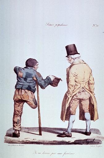 | Keywords: Refusing a beggar with one leg and a crutch.jpg  An amputee beggar holds out his hat to a well dressed man who is standing with his hands in his pockets Artist's caption's translation I don't give to idlers http //ihm nlm nih gov/luna/servlet/view/all/what/Amputees this webpage in the collection of http //ihm nlm nih gov/ Images from the History of Medicine which is a library of the U S government's http //nih gov National Institutes of Health Caricature by Edmé Jean Pigal 1798-1872 ; lithograph by Langlumé; published by Gihaut et Martinet PD-old-70 Joseph Langlumé Amputees in art Challenges to physical balance Crutches in art Patches Disabled beggars in art People with mobility impairment in art |
