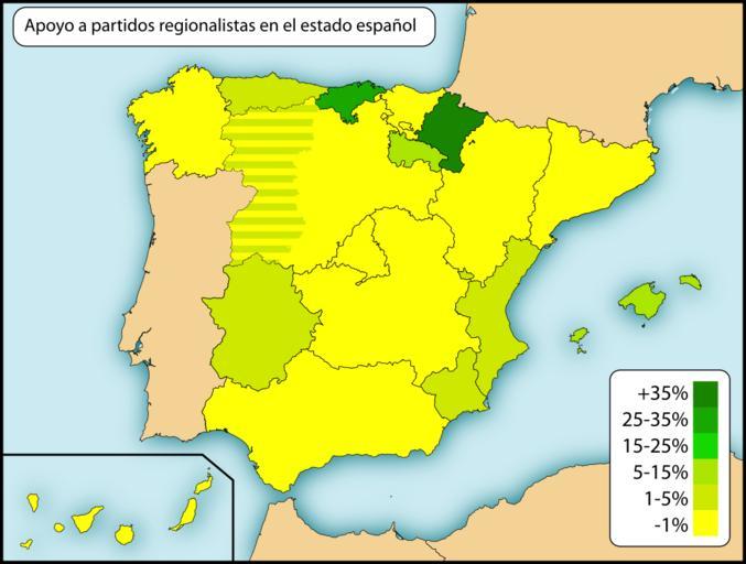 | Keywords: Regionalisme espanya castellà.svg es Apoyo electoral de los partidos regionalistas en España por comunidades autónomas Datos de las elecciones autonómicas de 2006 Cataluña 2007 resto del estado 2008 Andalucía y 2009 Galicia y País Vasco ca Suport electoral a partits regionalistes a l'estat espanyol per comunitats autònomes Dades de les eleccions autonòmiques de 2006 Catalunya 2007 resta de l'estat 2008 Andalusia i 2009 Galícia i Euskadi own Mutxamel based on HansenBCN original Political maps of Spain Regionalism in Spain |