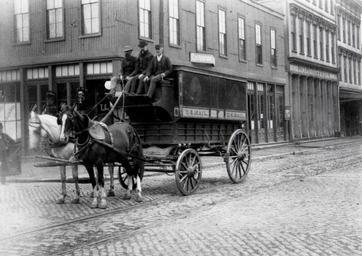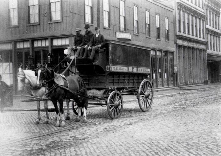 | Keywords: smithsonian institution smithsonianinstitution wagon usps san francisco sanfrancisco california cobble stone street cobblestonestreet government contractors governmentcontractors commons:collection=mail coach horses city urban nineteenth century nineteenthcentury 19th century 19thcentury 1800s 1890s victorian 19th century mail wagon 19thcenturymailwagon street horse drawn carriage horsedrawncarriage mail us mail usmail two horse twohorse black and white blackandwhite white horse whitehorse black horse blackhorse three men threemen town cobble stone cobblestone wgaon horse buildings men national postal museum nationalpostalmuseum mail across the commons mailacrossthecommons blackandwhite monochrome black and white Description: Employees driving a regulation mail wagon, size 3, on an unidentified San Francisco, California, street. The wagons were painted blue, with red and white features. The wagon was owned and operated by private companies that contracted with the Post Office Department for their use to carry sacks of mail between railroad depots and post offices. Creator/Photographer: Unidentified photographer Medium: Black and white photographic print Culture: American Geography: USA Date: 1895 Collection: U.S. Mail Wagons Repository: National Postal Museum Accession number: A.2008-31 Persistent URL: arago.si.edu/index.asp?con=2&cmd=1&id=194383 View more collections from the Smithsonian Institution. Description: Employees driving a regulation mail wagon, size 3, on an unidentified San Francisco, California, street. The wagons were painted blue, with red and white features. The wagon was owned and operated by private companies that contracted with the Post Office Department for their use to carry sacks of mail between railroad depots and post offices. Creator/Photographer: Unidentified photographer Medium: Black and white photographic print Culture: American Geography: USA Date: 1895 Collection: U.S. Mail Wagons Repository: National Postal Museum Accession number: A.2008-31 Persistent URL: arago.si.edu/index.asp?con=2&cmd=1&id=194383 View more collections from the Smithsonian Institution. |