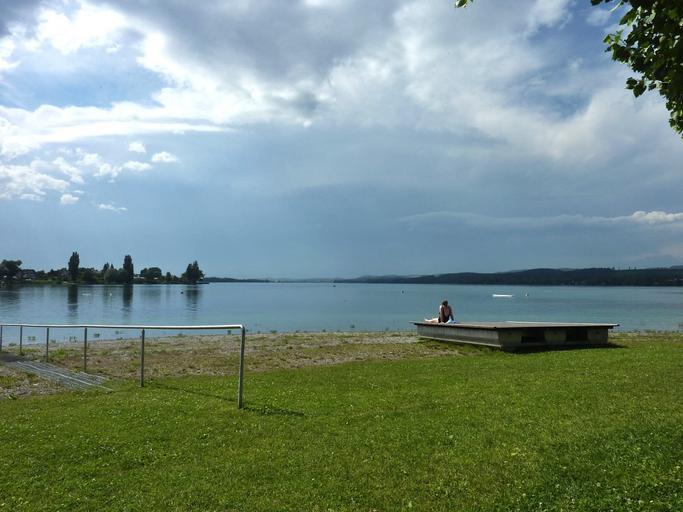Keywords: reichenau germany landscape lake water trees nature outside summer woman sky clouds shoreline